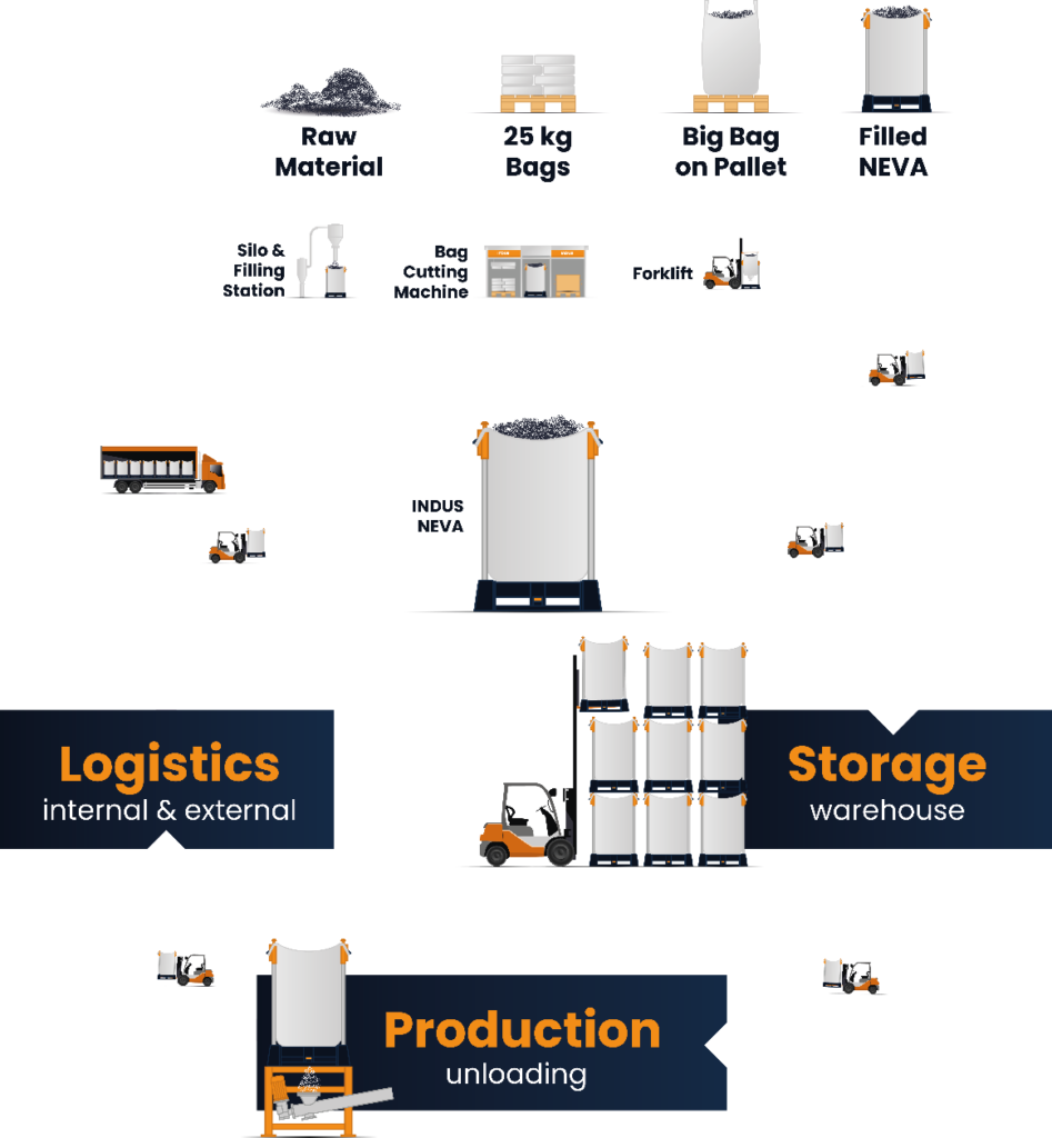 The NEVA big bag carrier securely contains and transports dry bulk materials in big bags while delivering exceptional space efficiency.