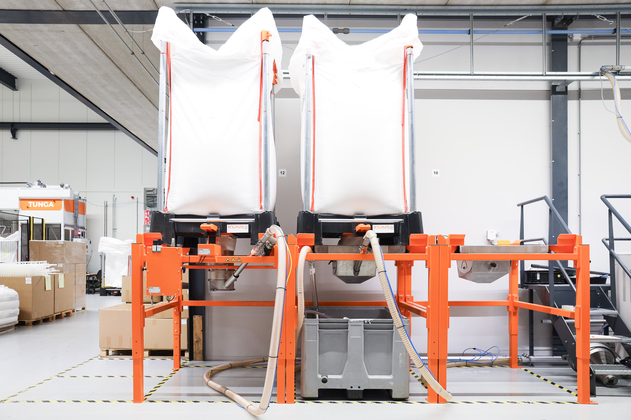 Nicht alle Materialien werden in Big Bags geliefert. Unbehandelte Polymere werden häufig weiterhin in 25-kg-Säcken angeliefert. Für eine kontinuierliche und großvolumige Produktion ist daher eine effiziente Umstellung von Säcken auf Big Bags entscheidend.