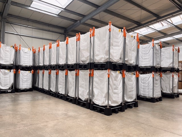- Netjes opgeslagen op twee niveaus hoog in het magazijn met behulp van het stapelbare Indus-systeem. Dit bespaart meer dan 60 m² vloeroppervlak in vergelijking met het naast elkaar opslaan van big bags op de vloer. Een standaard big bag op de vloer neemt 1,21 m² in beslag (ruimte: 110×110 cm), terwijl Indus-systemen (120×120 cm = 1,44 m²) twee niveaus hoog kunnen worden gestapeld - waardoor de benodigde ruimte bijna wordt gehalveerd.