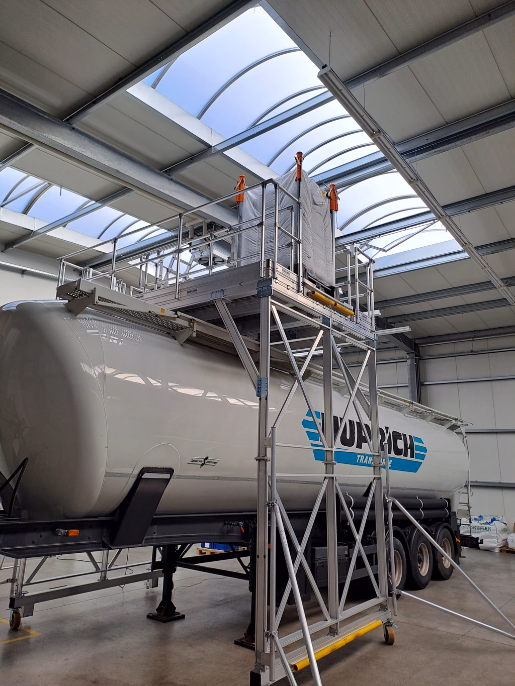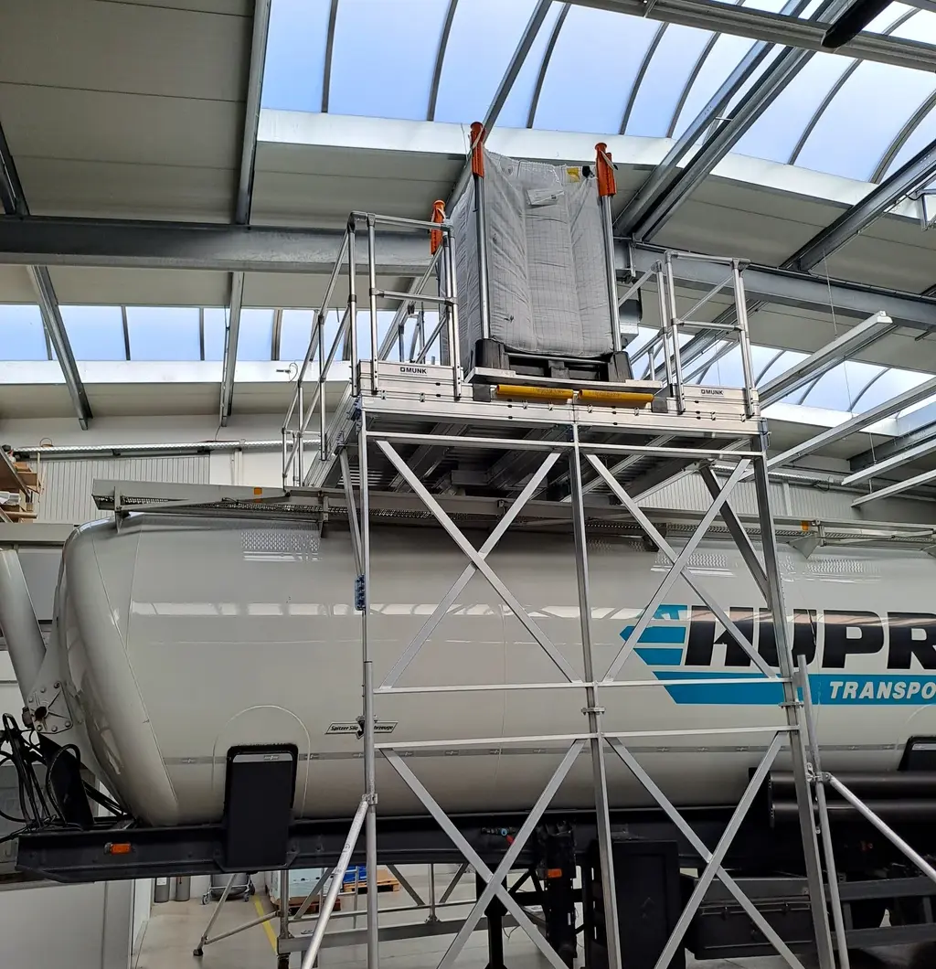 Ze implementeerden een aangepast platform boven de vrachtwagen (zie foto) waar het Indus systeem kan worden geplaatst. Als ze klaar zijn, openen ze gewoon de schuif en het materiaal stroomt direct van de big bag in de silowagen eronder - een schoon, efficiënt en veilig proces.