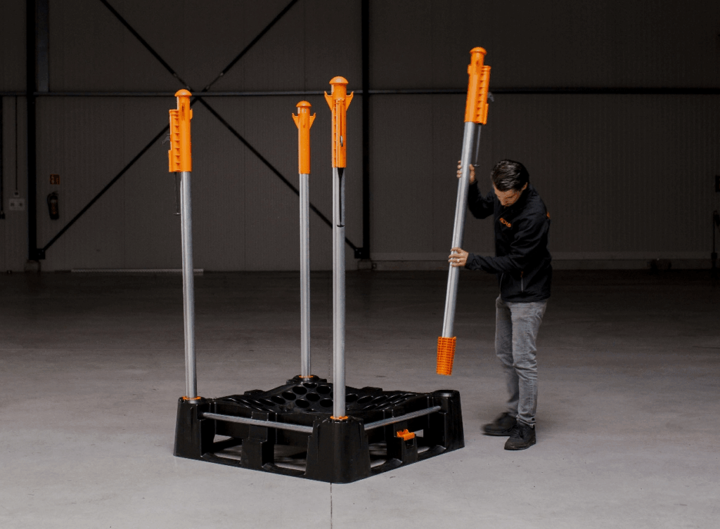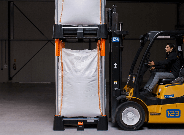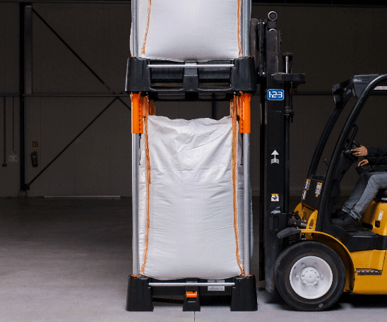 Safe and efficient stacking of big bags up to 7 meters high and 6.000 kg. Easy to dismantle and small to store.