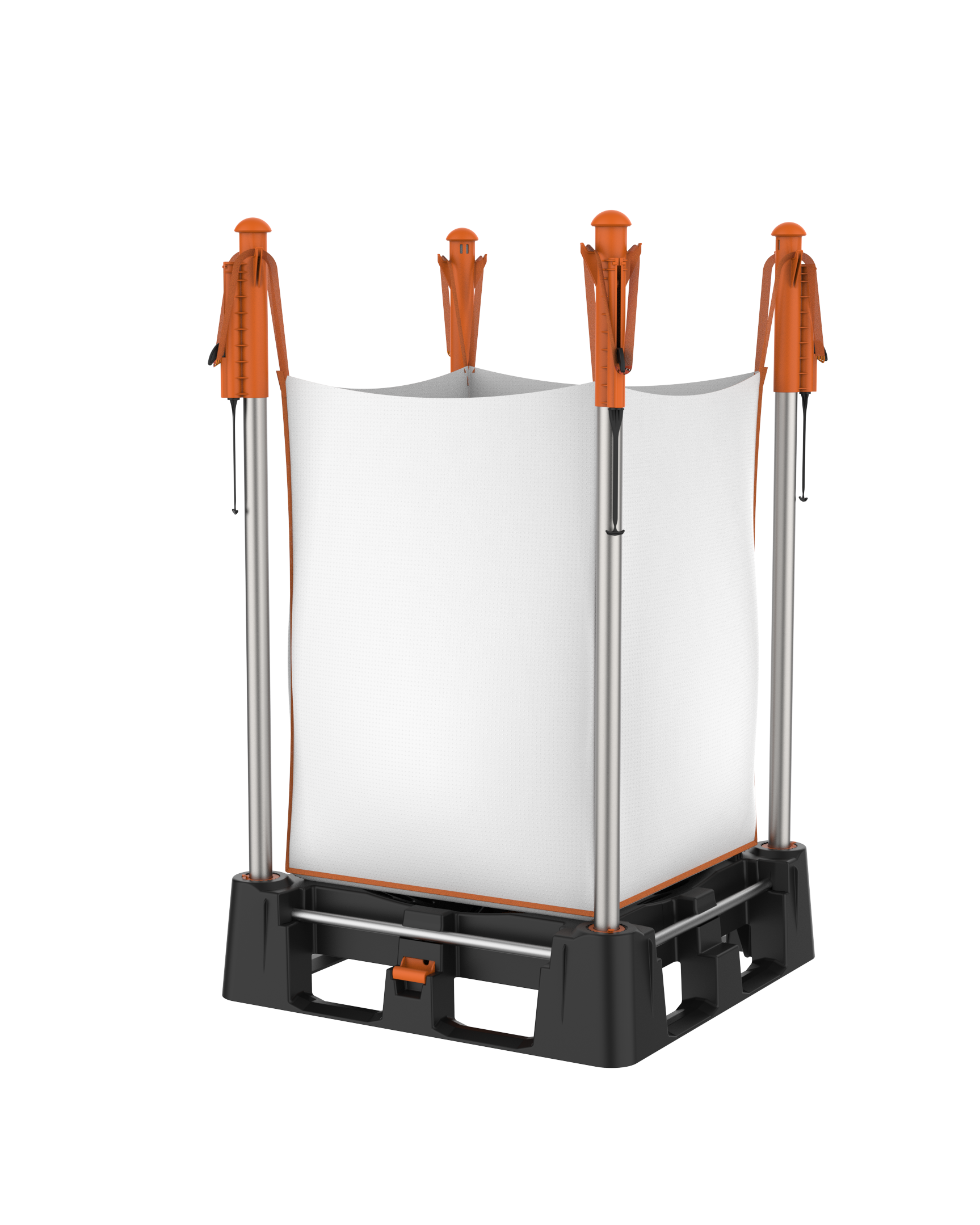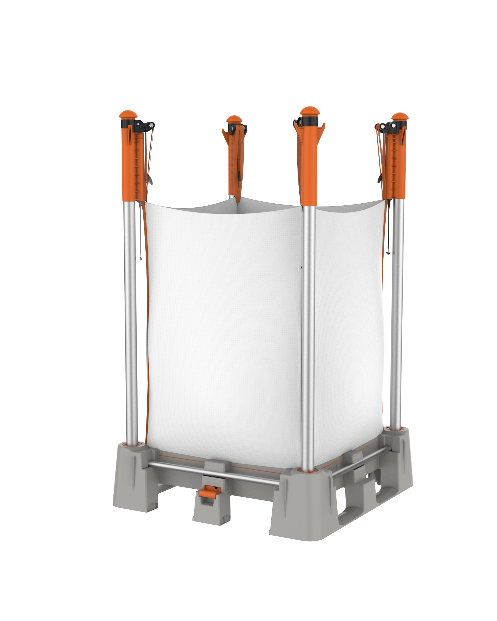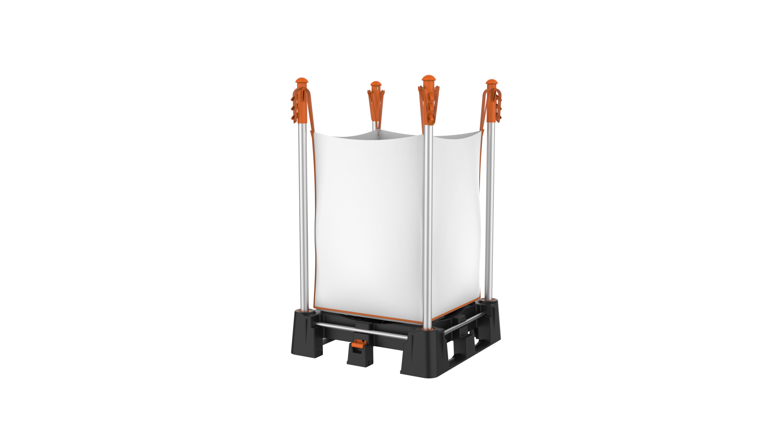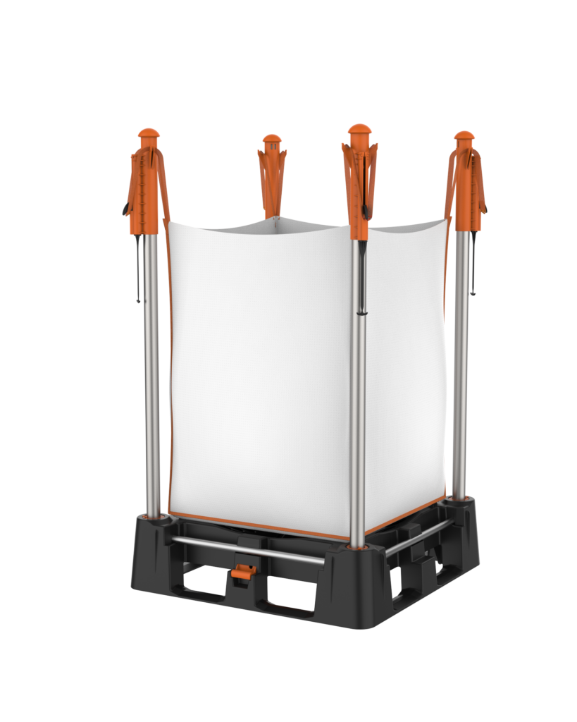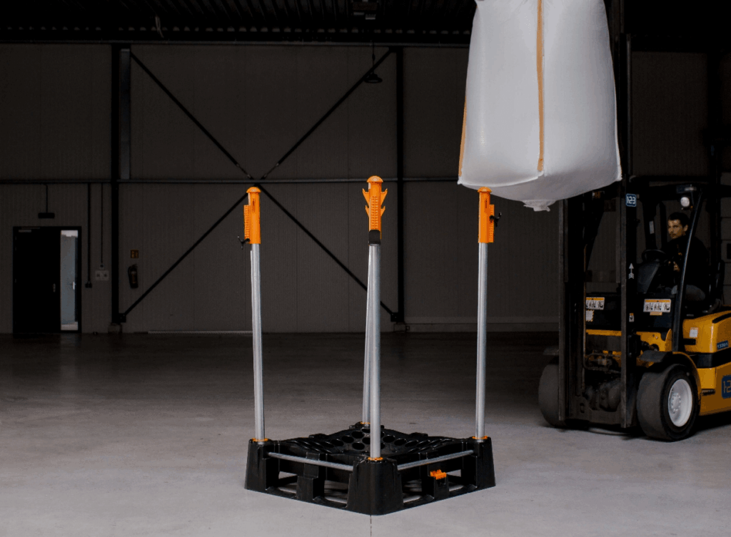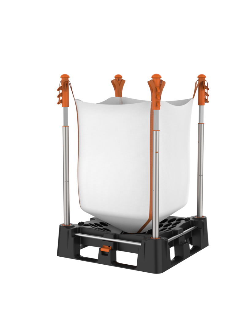 Its poles are adjusted to fit your specific big bag dimensions, enabling secure stacking up to 7 meters high and stable transport that ensures efficient material flow throughout your facility.